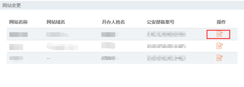 已完成备案的网站如果有信息需要变更,点击主页左侧菜单【网站信息变更】选择要变更的网站,点击编辑小图标对网站信息进行编辑,编辑完成后,点击【提交】。